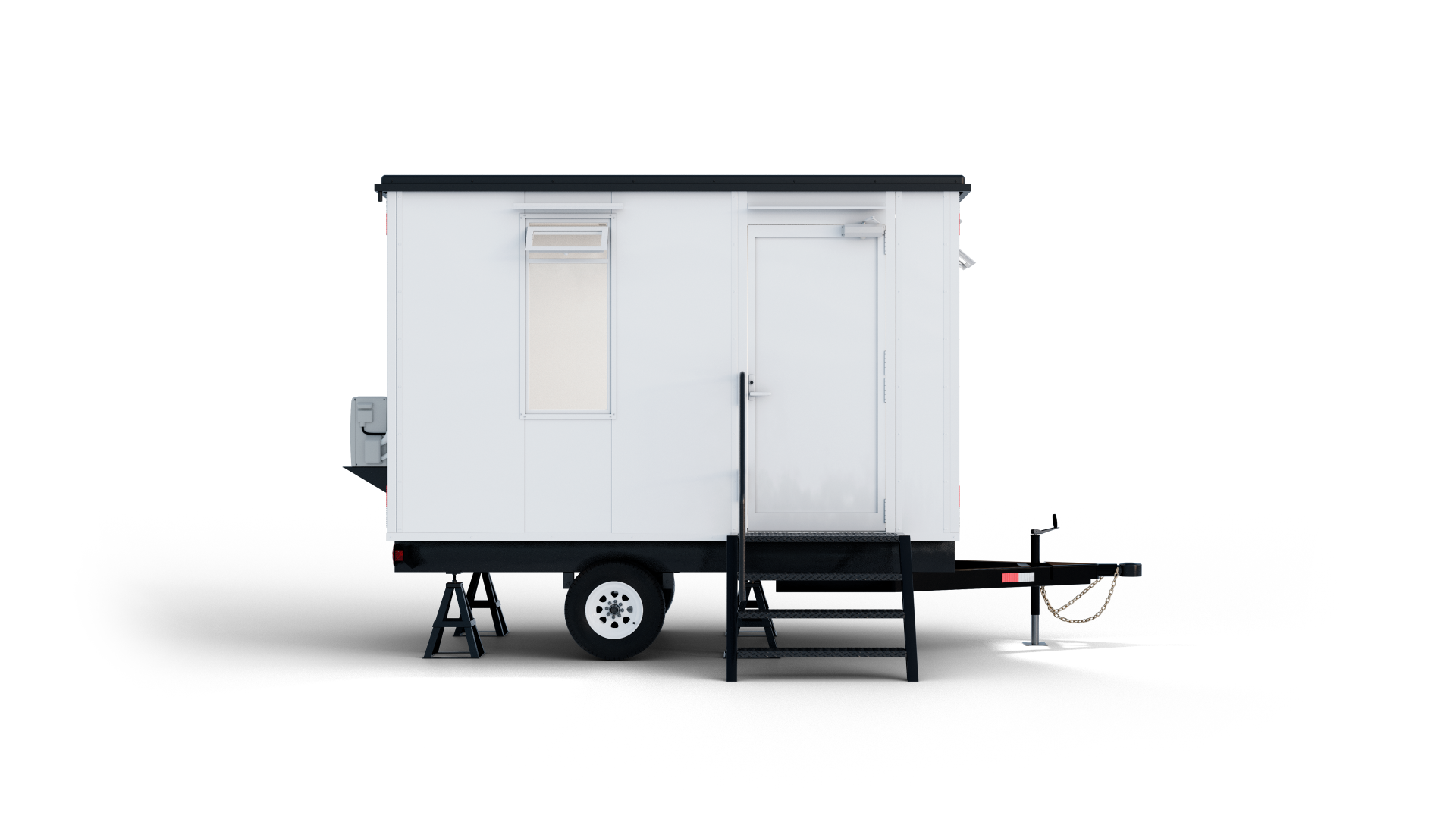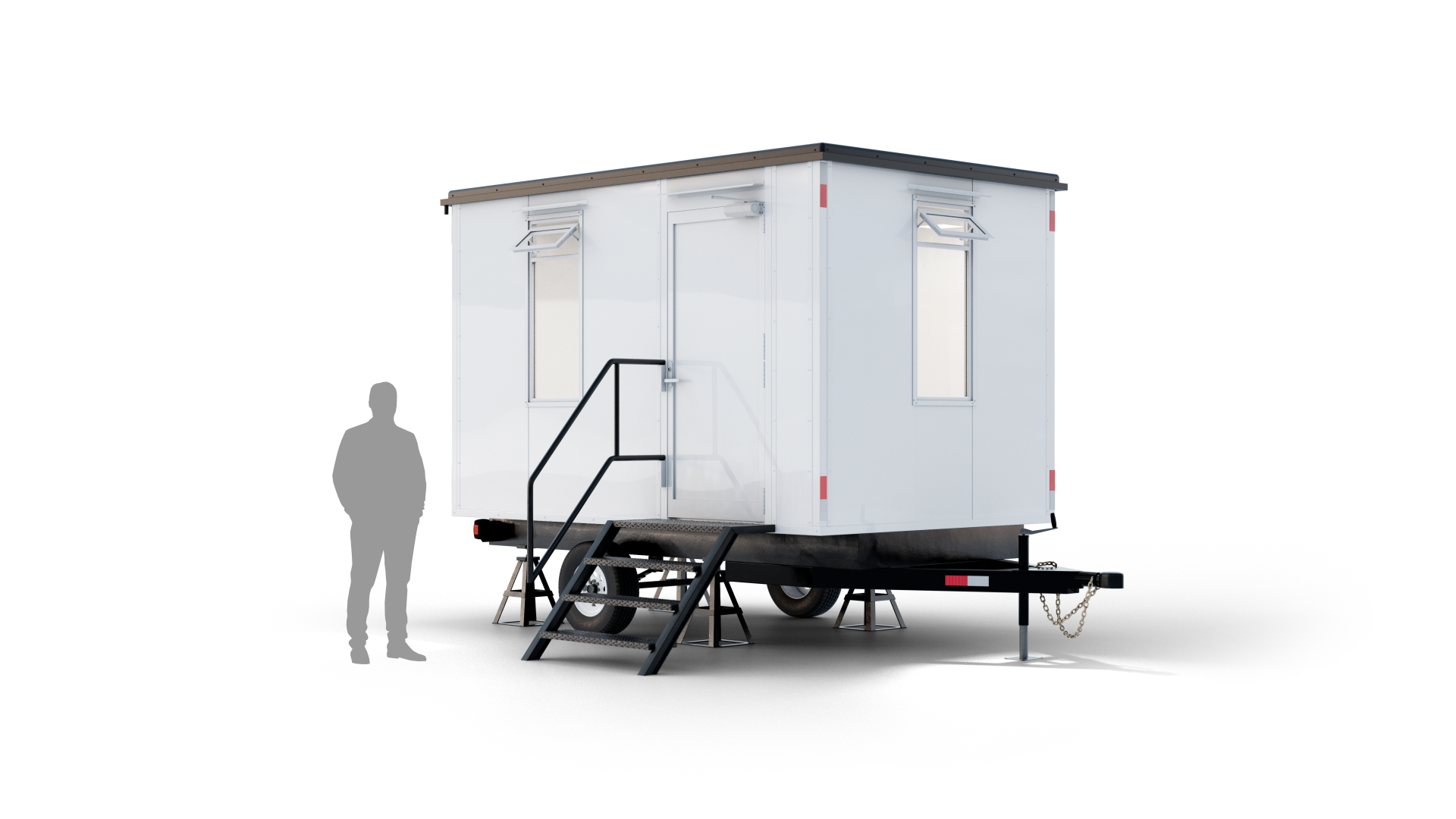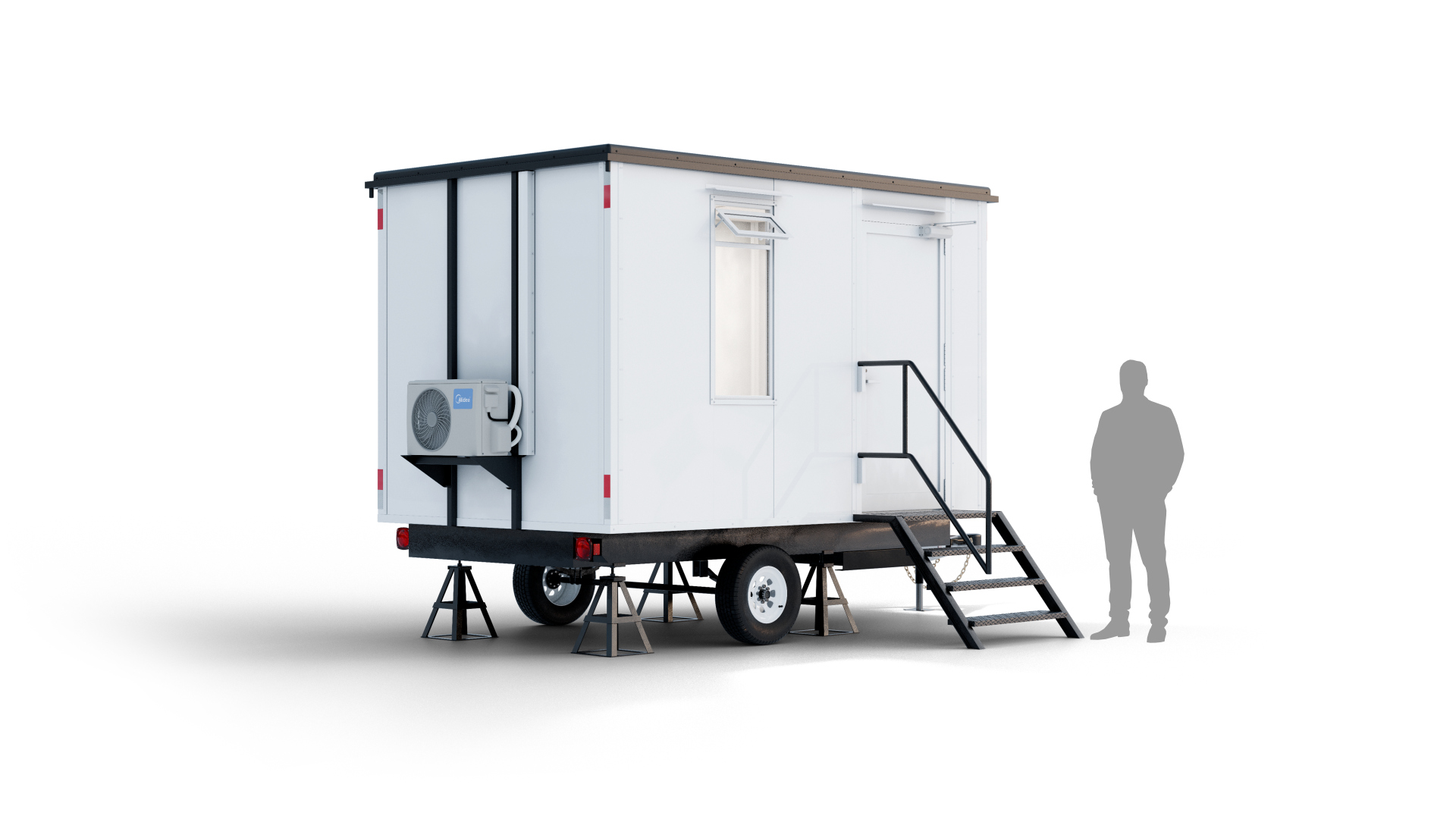 La oficina móvil de 4 metros de largo por 2.5 metros de ancho y 3.38 metros de alto ofrece una superficie de 10 m² diseñada para brindar comodidad y funcionalidad en cualquier ubicación. Esta unidad es ligera y de fácil transporte, equipada con aire acondicionado, mesas de trabajo, y luminarias LED para un ambiente de trabajo óptimo. Con una suspensión de ballesta de un eje, luces de navegación, escalera con barandal y tirón para remolque, es ideal para despliegues temporales o sitios de trabajo en constante movimiento.